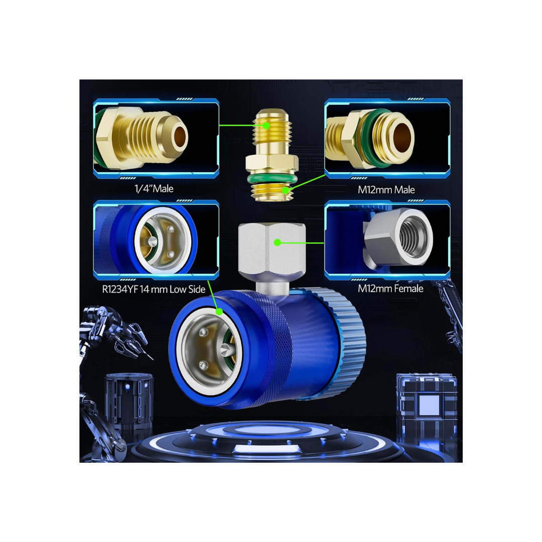 Adaptador profesional para gas refrigerante R1234yf lado bajo (14 mm) con conectores múltiples (1/4″, M12 macho y hembra). Ideal para talleres de aire acondicionado automotriz que requieren versatilidad y compatibilidad.