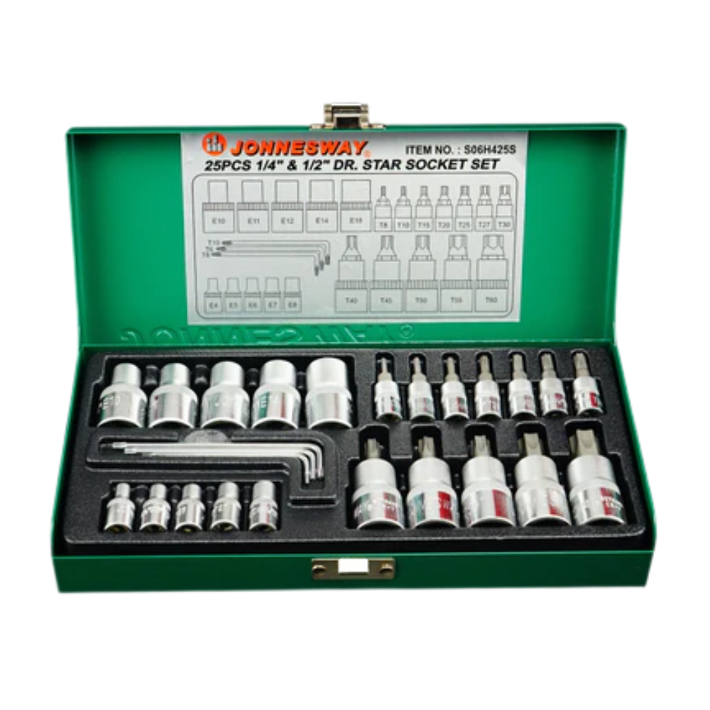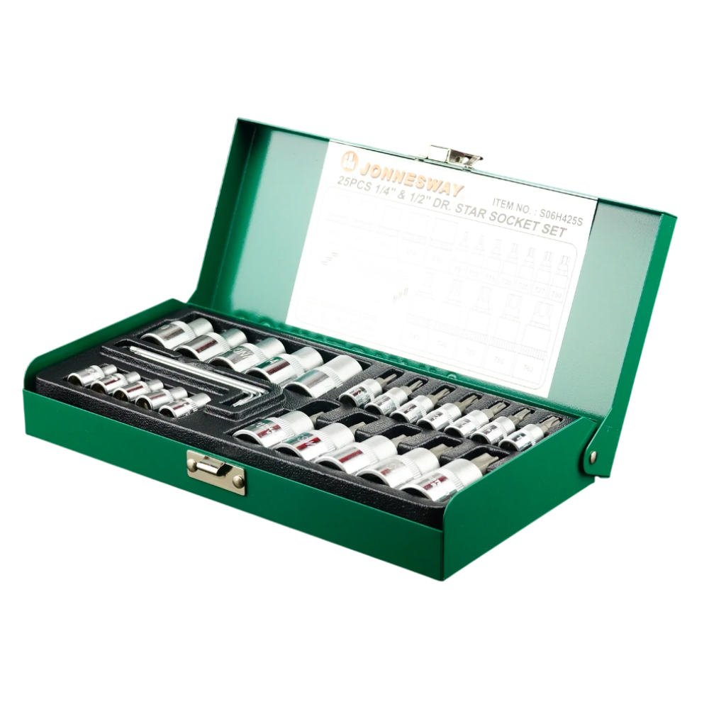 El set S06H425S de JONNESWAY es la solución definitiva para el técnico que busca versatilidad sin comprometer el espacio. Fabricado con aleaciones de acero de alta calidad y un acabado de precisión, este juego integra dos tamaños de mando (1/4″ y 1/2″) para adaptarse tanto a trabajos delicados como a aquellos que requieren mayor fuerza.